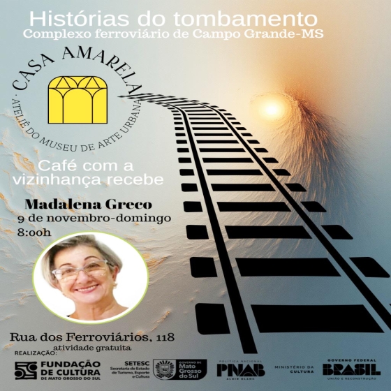 “Teremos quatro encontros ao longo desse período – nos dias 9 e 23 de novembro e 7 e 21 de dezembro, sempre aos domingos, a partir das 8h30. A ideia é reunir pessoas queridas em torno de um café e de boas conversas, resgatando histórias e afetos ligados à ferrovia. A cada encontro, será servido memórias e afetos junto ao tradicional ‘café da manhã do trem’, em conversas que relembram a história viva do Complexo Ferroviário de Campo Grande”, explica Tatiana De Conto, a arteterapeuta, idealizadora do projeto e gestora da Casa Amarela ao lado do artista Guido Drummond.