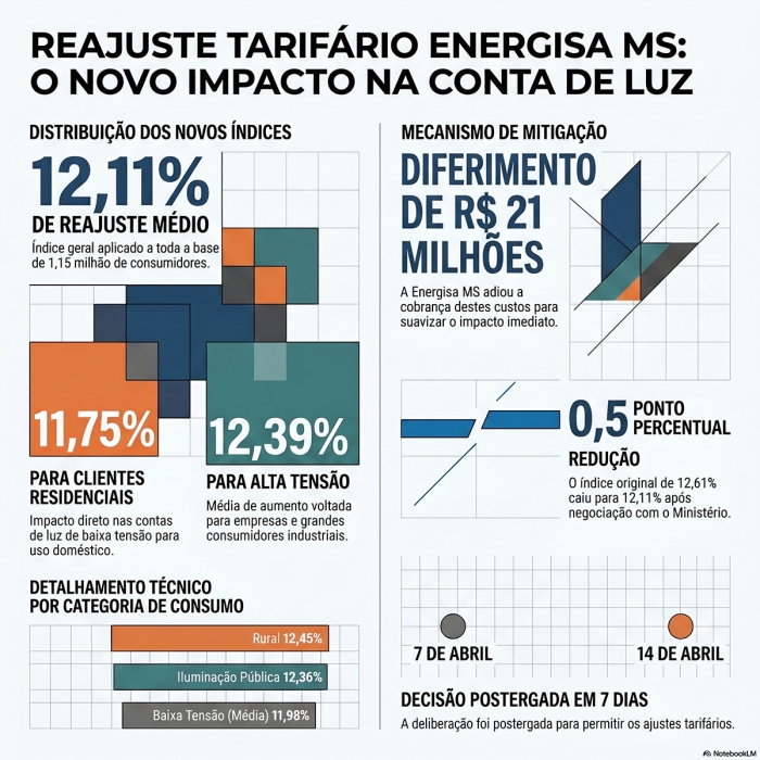 No dia 6 deste mês, a Energisa MS apresentou ofício comunicando que aceita o adiamento em uma semana, “com o intuito de contribuir com a avaliação de possíveis alternativas destinadas a mitigar os impactos de reajustes tarifários aos clientes”, enfatizando que “concorda com a postergação da homologação do Reajuste Tarifário Anual a ser deliberado no dia 7 de abril de 2026 para o dia 14 de abril de 2026”.