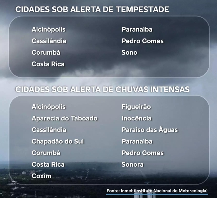 O Inmet (Instituto Nacional de Meteorologia) emitiu, nesta terça-feira (14), dois alertas de chuvas intensas e tempestades que atingem diversas regiões de Mato Grosso do Sul. Os avisos, de perigo e perigo potencial, valem até as 10h de quarta-feira (15) e indicam possibilidade de ventos fortes, granizo e alagamentos.