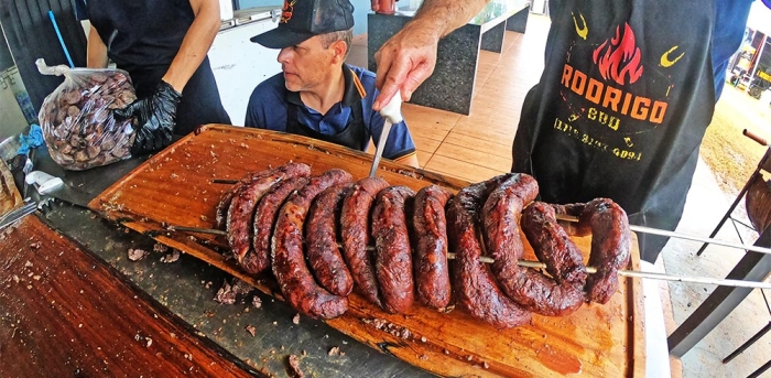 A equipe responsável pelo churrasco trabalha a todo vapor desde as 4h da manhã, com a churrasqueira já acesa. Paralelamente, a equipe da cozinha prepara os acompanhamentos, como arroz, saladas e outros pratos.