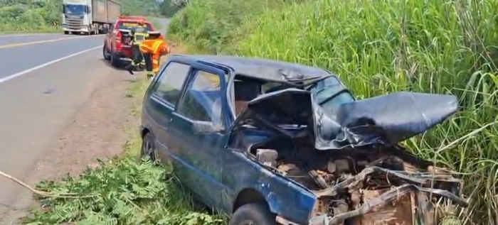 O Corpo de Bombeiros foi acionado e, ao chegar ao local, encontrou duas pessoas caídas ao solo com ferimentos graves e uma terceira vítima consciente. Com a força do impacto, a parte frontal do automóvel ficou completamente destruída, enquanto a motocicleta foi arremessada para fora da pista, ficando destruída às margens da rodovia.
