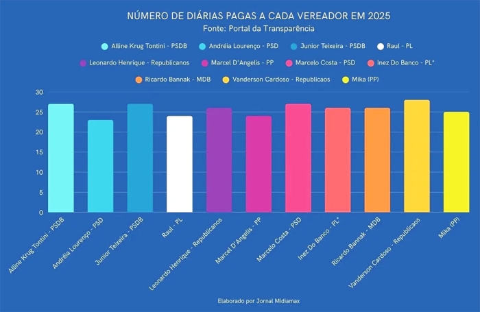 A LOA (Lei Orçamentária Anual) de 2025 previu despesas de R$ 15,5 milhões com a Casa de Leis. Ou seja, a Câmara de Vereadores teria gasto cerca de 16% do orçamento do ano em diárias.