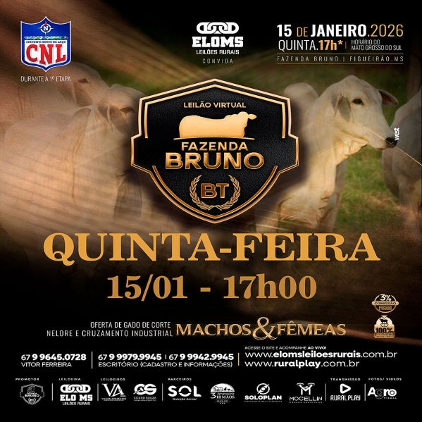 O Leilão Virtual Fazenda Bruno será realizado na quinta-feira, 15 de janeiro de 2026, a partir das 17h (horário de MS), durante a abertura da 1ª etapa do CNL. A condução ficará por conta da ELOMS Leilões Rurais, com oferta de gado de corte – machos e fêmeas – das raças Nelore e cruzamento industrial.