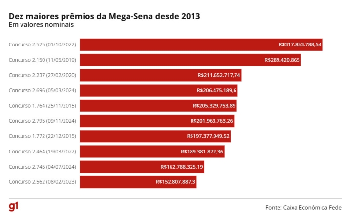 Já para uma aposta com 20 dezenas (limite máximo), com o preço de R$ 232.560,00, a probabilidade de acertar o prêmio é de 1 em 1.292, ainda de acordo com a instituição.