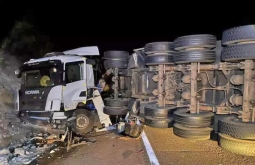 Coxim Caminhão tenta ultrapassagem, bate em paredão e espalha diesel na BR-163.