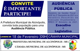 Alcinópolis A Prefeitura Municipal de Alcinópolis convida toda população para uma “Audiência Pública”.Dia 18 de fevereiro de 2022, às 09:00 h.