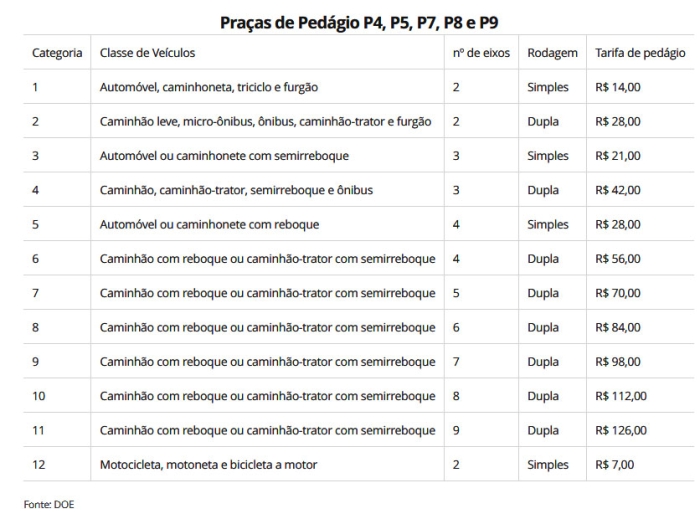 O aumento foi publicado no Diário Oficial do Estado (DOE) e, conforme o documento, a tarifa para a categoria 1 (Automóvel, caminhoneta, triciclo e furgão), nas praças de pedágio P4, P5, P67, P8 e P9 saiu de R$13,50 para R$14 e na praça P6, de R$4,40 para R$4,60.