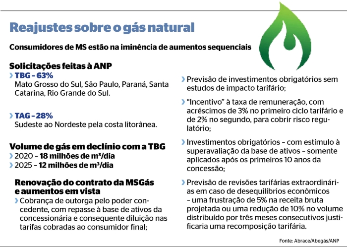 Em paralelo às definições sobre a tarifa no transporte do gás natural pela TBG, que envolve a saída do combustível da Bolívia e a entrada no Brasil por Corumbá, Mato Grosso do Sul também avalia prorrogar o contrato da MSGás antes do prazo, para garantir uma mudança antecipada no modelo regulatório do serviço.